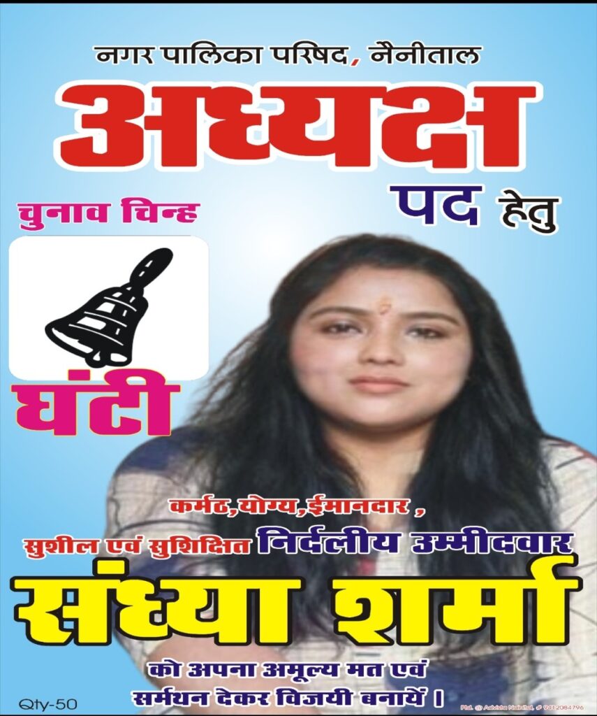 नैनीतालl सरोवर नगरी में निर्दलीय अध्यक्ष पद प्रत्याशी संध्या शर्मा ने चुनाव प्रचार मैं ताकत झोंकते हुए प्रचार की शुरुआत स्टाफ हाउस से की इस दौरान उनके साथ दर्जनों कार्यकर्ताओं ने घर-घर जाकर संध्या शर्मा के लिए वोट मांगे संध्या क्षेत्र में भी प्रचार करने पहुंच रही हैंl वहां पर बुजुर्ग पुरुष महिला लोगों के पैर छूकर आशीर्वाद मांग रही हैl हंसमुख स्वभाव की संध्या को लोगों का प्यार भी मिल रहा हैl संध्या ने प्रचार के दौरान कहां छोटे से हमारे नैनीताल परिवार के चुनाव में लाखों रुपए खर्च करके जनता का पैसा बर्बाद कर रहे हैं मुख्यमंत्री धामी वह किया विकास करेंगे और पिछले 10 सालों में क्या विकास हुआ है नैनीताल में सब जानते हैं बेरोजगारी चरम पर है महंगाई के चलते घरों के चूल्हे समय से नहीं जल रहे हैंl और इन सब चीजों पर तो इनका कंट्रोल नहीं हैl और जनता को गुमराह आकर कर रहे हैं अब जनता इनके बहकावे में आने वाली नहीं हैl राष्ट्रीय पार्टियों ने हमेशा शहर को लूटा है पालिका कर्मचारियों को राज्य बनने के बाद से समय से वेतन तक नहीं मिलता हैl और बात विकास की करते हैं जब से सत्ता में आए हैं प्रदेश की जनता को जातिवाद में बांट दिया हैl इस दौरान संध्या के कार्यकर्ताओं ने नारे लगाकर उनका प्रचार किया और कहा तुम संघर्ष करो जनता तुम्हारे साथ हैl बता दे संध्या संघर्ष करते हुए प्रचार करते हुए आगे बढ़ रही हैl और जनता का उनका भरपूर समर्थन प्यार और आशीर्वाद मिल रहा हैl इस मौके पर दीपक कुमार, नवीन जोशी, गीता, पार्वती गेरा, कविता, भावना, मोहित, अक्षय, नितिन, फैजान, सहित दर्जनों कार्यकर्ता मौजूद थेl
