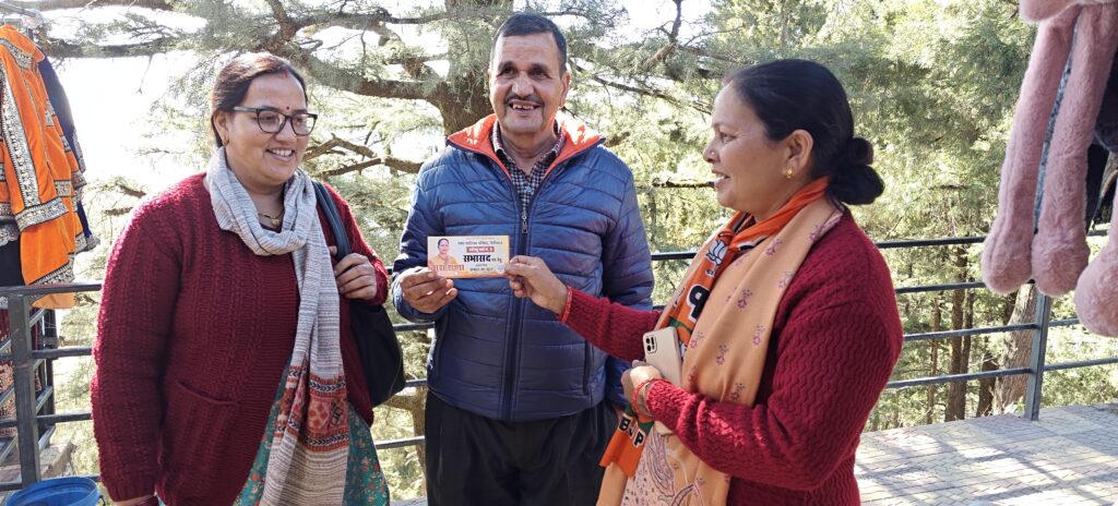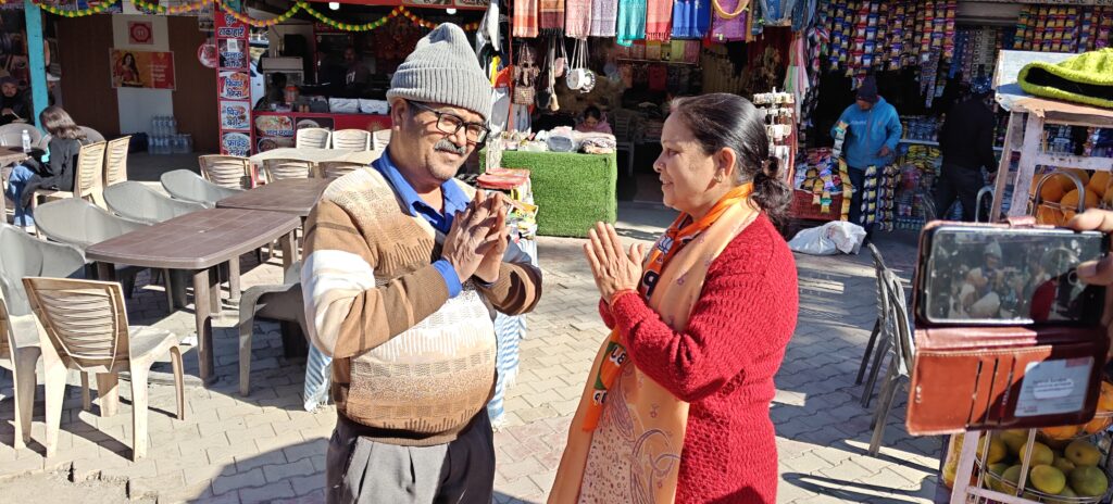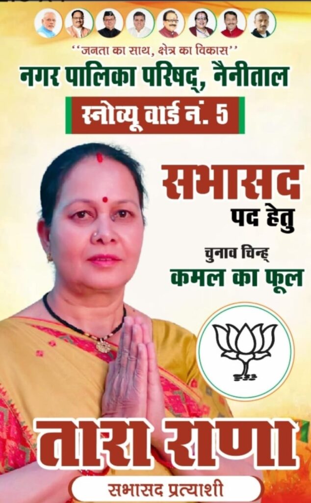 नैनीतालl सरोवर नगरी में नगर पालिका चुनाव का शोरगुल शहर में मचने लगा हैl स्नो व्यू वार्ड नंबर 5 से भाजपा की उम्मीदवार और सभासद प्रत्याशी तारा राणा ने चुनाव प्रचार तेज करते हुए घर-घर पहुंचकर कमल के फूल में मोहर लगाकर वोट देने की अपील कर रही हैl उनके कार्यकर्ता वार्ड के अलग-अलग क्षेत्र में लोगों के पास पहुंचकर तारा दीदी के लिए वोट मांग रहे हैं और जनता का समर्थन देखकर वह गदगद हो जा रहे हैंl और वह नारे लगा रहे हैं अबकी बार सभासद तारा दीदी तारा दीदी इससे क्षेत्र में चुनावी माहौल बन रहा हैl सभासद प्रत्याशी तारा राणा भी मतदाताओं से कह रही है शहर में ट्रिपल इंजन की सरकार बना दो और वार्ड में भाजपा प्रत्याशी जीता दो शहर और वार्ड में विकास ही विकास होगा सरकारी सभी योजनाओं को जनता तक पहुंचाया जाएगाl इस मौके पर उनके कार्यकर्ता चुनाव प्रचार में जुटे हुए थेl