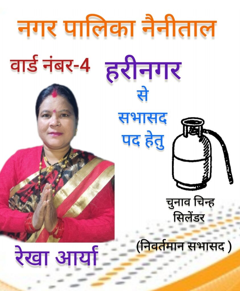 नैनीतालl सरोवर नगरी में नगर पालिका चुनाव की धूम चल रही है और प्रत्याशी मतदाताओं को लुभा रहे हैl हरीनगर वार्ड संख्या 4 से निवर्तमान सभासद रेखा आर्य ने भी चुनाव प्रचार तेज करते हुए हरी नगर,मस्जिद क्षेत्र, धोबी घाट सहित सभी क्षेत्रों में जाकर मतदाताओं से जनसंपर्क किया और उनके द्वारा किए गए कार्यों को बताते हुए उन्हें पुनः एक बार फिर उनके पक्ष में मतदान करने की अपील की है l बता दें रेखा के लिए चुनौती है लेकिन चुनाव में दोबारा जीत कर आने का सफर लोग उनके कार्यों को मतदाता समझेंगे तो आसान होगाl फिलहाल उन्होंने और उनके कार्यकर्ताओं ने घर घर जाकर प्रचार तेज कर दिया हैl और मतदाताओं से निवेदन कर रही हैंl उनके पक्ष में मतदान करेंl इस मौके पर उनके कार्यकर्ता उनके प्रचार में जुटे हुए हैं और वोट की अपील कर रहे हैंl