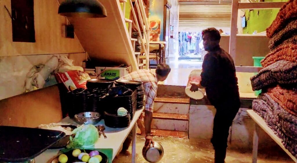 मल्लीताल मोहनको स्थित नैनीताल रसोई रेस्टोरेंट में वर्षा का पानी भरा