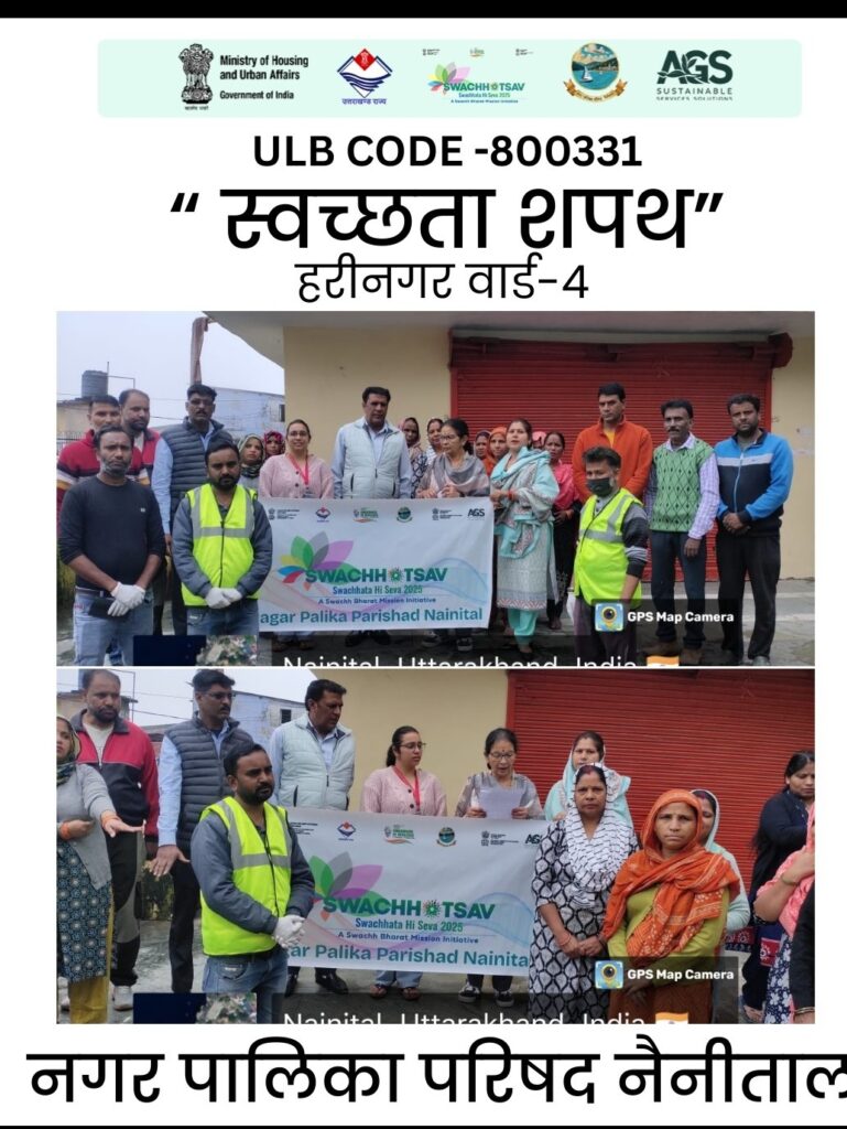नैनीताल। सरोवर नगरी में शहरी विकास निदेशालय के दिशा निर्देश अनुसार स्वच्छ भारत मिशन 2.0 के अनुपालन में स्वच्छता ही सेवा 2025 की थीम पर नगर पालिका परिषद नैनीताल द्वारा हरी नगर वार्ड में चिन्हित सीटीयू पर विशेष सफाई अभियान चलाया गया। इस दौरान लोगों को स्वच्छता के प्रति जन जगरूप वह प्रचार प्रसार कर गंदगी ना करने की अपील की गई, इसके साथ स्वच्छता शपथ भी दिलाई गई। इस दौरान सफाई अभियान में नगर पालिका अध्यक्ष डा सरस्वती खेतवाल हरी नगर वार्ड सभासद शीतल कटियार ‌ सफाई दरोगा दिनेश कटियार सफाई हवलदार संजय भगत ओर पर्यावरण पर्यवेक्षक, पर्यावरण मित्र शाहिद अन्य पालिका कर्मी मौजूद थे।