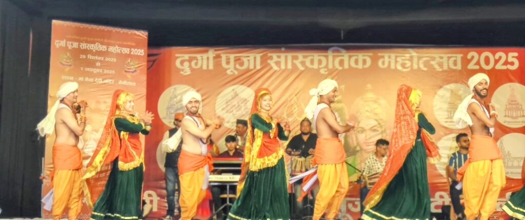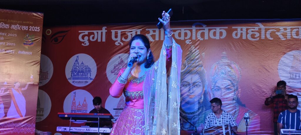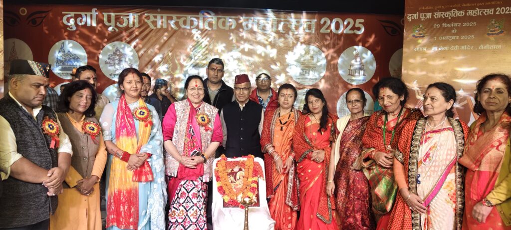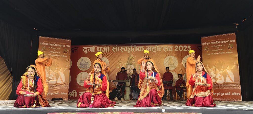 नैनीताल। सरोवर नगरी के दुर्गा पूजा महोत्सव मे सोमवार को सांस्कृतिक कार्यक्रम का मुख्य अतिथि विधायक सरिता आर्य ओर विशिष्ट अतिथि अध्यक्ष महिला उद्यमिता विभाग रेनू अधिकारी ने संयुक्त रूप से उद्वघाटन किया। बता दें सर्वजनिन दुर्गा पूजा कमेटी की ओर से आयोजित 69वें दुर्गा पूजा महोत्सव के दूसरे दिन मंदिर परिसर में विभिन्न धार्मिक अनुष्ठान हुए।इसके साथ ही डीएसए मैदान में सांस्कृतिक कार्यक्रमों की धूम रही। विधायक सरिता आर्या ने कार्यक्रमों का शुभारंभ किया। विभिन्न स्कूलों से आए कलाकारों ने अपनी प्रस्तुति दी।जिसमे लवली पब्लिक स्कूल, नैनी पब्लिक स्कूल, अमेरिकन किड्स, गोल्जू ग्रुप नैनीताल, घुघुति कला संस्कृति संस्था,कुमाऊनी संस्कृति उत्थान मंच,नैनीताल, कुमाऊं संस्कृति कला दर्शन लोहाघाट ने रंगारंग कार्यक्रम प्रस्तुत किए। आज वाली स्टार नाइट कार्यक्रम में लोक कलाकार इंदर आर्य ओर मेघा चंद्रा के गीतों पर दर्शक खूब झूमे।उन्होंने हे मधु ,सवारी सवारी ,गुलाबी शरारा, एके 47 हाथ मा,मॉडर्न कुमाऊं,लहँगा,हिट मधुली , हफ्ते में ऐतवार का दिन कोशी गाड़ा धाना ,इंटर में फेल, मधुली हीरा, मैं छु ठेठ पहाड़ी सहित अन्य गानों की प्रस्तुति देकर समा बांध दिया । इस दौरान अध्यक्ष बहादुर सिंह बिष्ट, वरिष्ठ उपाध्यक्ष त्रिभुवन फ़र्त्याल, भासकर बिष्ट, मंजू रौतेला, सुमन शाह ,रश्मी राणा, कुसुमलता सनवाल ,मीनू ,भावना, सावित्रि सनवाल सहित अन्य लोग मौजद रहे।