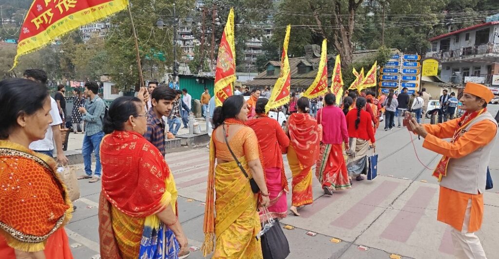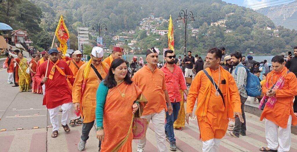 नैनीताल। सरोवर नगरी में शनिवार हल्द्वानी काठगोदाम और लाल कुआं से नैनीताल पहुंचे सत्य सनातन भक्ति शक्ति जन जागरण अध्यात्मिक अभियान यात्रा में हनुमान भक्तों ने हनुमानगढ़ पाषाण देवी मंदिर और श्री राम सेवक सभा प्रांगण और मां नैना देवी मंदिर में हनुमान चालीस का पाठ कर सनातन धर्म का प्रचार किया। प्रातः सभी भक्तगण हनुमानगढ़ मंदिर पहुंचे वहां हनुमान चालीसा का पाठ करने के पश्चात पाषाण देवी मंदिर पहुंचे वहां पर भी हनुमान चालीसा का पाठ किया और रैली के माध्यम से गांधी चौक माल रोड होते हुए श्री राम सेवक सभा प्रांगण पहुंचे। और उसके पश्चात उन्होंने भगवा ध्वज के नीचे संघे शक्ति का प्रचार कर भारत का वैभव फैलाने का संदेश दिया। बता दे हल्द्वानी व आसपास से 12 बसों में भरकर लगभग 500 भक्त नैनीताल पहुंचे। यहाँ तल्लीताल बस स्टैंड से मॉल रोड में ‘जय श्री राम’ के ध्वज लेकर भक्त जुलूस के रूप में मल्लीताल पहुंचे। और सभी भक्तों ने कैपिटल सिनेमा के समीप भगवा ध्वज पाठ किया। इस गैर राजनीतिक दल का नेतृत्व कर रहे पंकज खत्री ने कहा कि वो यहां नेतागिरी नहीं कर रहे बल्कि भगवान श्री राम चंद्र के पदचिन्हों पर चल रहे हैं। कहा कि ये भक्त आज 205वां अयोजन कर रहे हैं। उन्होंने बताया कि मंगलवार का पाठ हल्द्वानी के शीशमहल मंदिर में होता है, जबकि शनिवार को दल घूम घूमकर दूर दराज के क्षेत्रों में हनुमान चालीसा पाठ कर धर्म का संदेश देते हैं। भक्तों पर पुष्प वर्षा भी की गई। इस मौके पर दल का नेतृत्व कर रहे पंकज खत्री, मोहन पाठक, गिरीश चंद लोहानी, गोविंद सिंह बिष्ट, गौरव चौहान, हिमांशु बिष्ट, उमेश, कृष्ण चंद बेलवाल आदि के साथ नैनीताल से मंनोज कुमार, विवेक वर्मा, तरुण लूथरा , मयंक पंत, विनोद सिंह, विनोद कुमार, सोनू बिष्ट, भावना रावत, राजीव साह, कुंदन सिंह टिलारा, अधिवक्ता भागवत मेहरा, आकाश कुमार सहित अन्य भक्तों ने हनुमान चालीसा का पाठ किया।