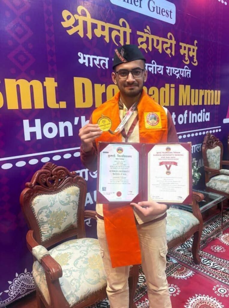 नैनीताल । कुमाऊँ विश्वविद्यालय नैनीताल के २०वें दीक्षांत समारोह में नगर के दुर्गापुर स्थित प्रतिष्ठित पार्वती प्रेमा जगाती सरस्वती विहार नैनीताल के पूर्व छात्र सुदर्शन सोराड़ी को उनकी उत्कृष्ट शैक्षणिक उपलबधियों के लिए राष्ट्रपति द्रौपदी मुर्मू के करकमलों द्वारा स्वर्ण पदक से समानित किया गया।