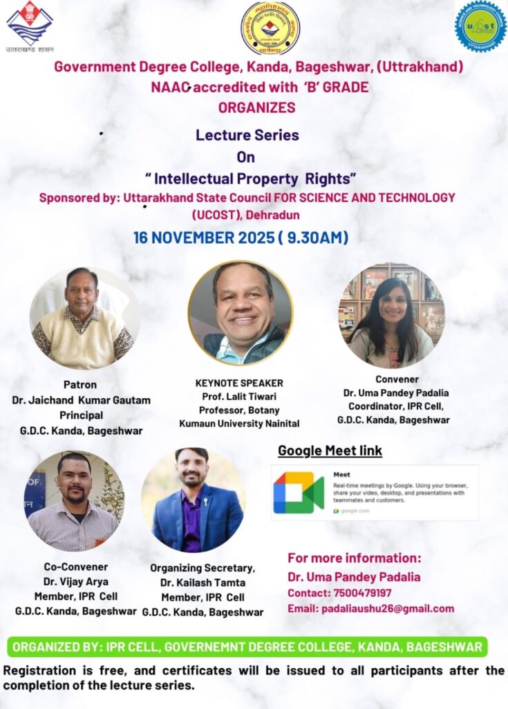गवर्नमेंट डिग्री कॉलेज, कांडा, बागेश्वर, उत्तराखंड द्वारा 16 नवंबर 2025 को “इंटीलेक्टुअल प्रॉपर्टी राइट्स” विषय पर यूकॉस्ट के सहयोग से एक विशेष ऑनलाइन व्याख्यान का आयोजन किया गया।