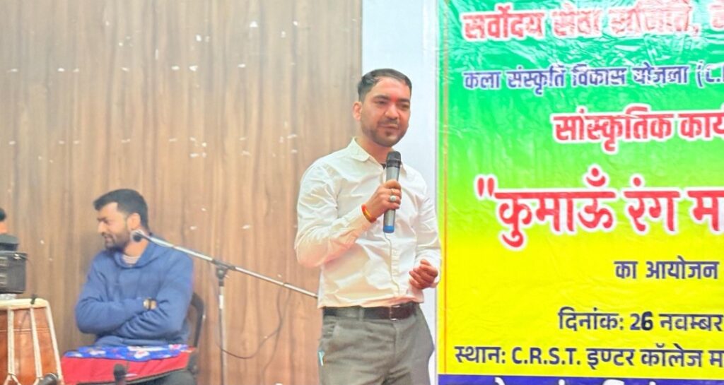 संस्कृति को समर्पित ‘ सर्वोदय सेवा समिति संस्थान नैनीताल द्वारा उत्तराखण्ड संस्कृति मंत्रालय भारत सरकार के सहयोग से विकास तथा कला और सांस्कृतिक कार्यक्रमों के माध्यम से प्रचार प्रसार तथा पारम्परिक सांस्कृतिक संगीत नृत्य कार्यक्रम का आयोजन सी.आर.एस.टी में आयोजित किया गया। कार्यक्रम का उद्घघाटन मुख्य अतिथि मनोज पाण्डे जी प्रधानाचार्य सी.आर.एस.टी. इन्टर कालेज के द्वारा दीप प्रज्वलित कर कार्यक्रम का शुभारम्भ किया गया। संस्था के अध्यक्ष आनन्द मेहरा ने मुख्य अतिथि का स्वागत बेज अलंकार कर प्रतीक चिन्ह देकर सम्मानित किया गया। संस्था के महासचिव द्वारा सम्मानित दर्शको व स्कूल के समस्त शिक्षक, शिक्षिकाएं समस्त स्टाफ व विद्यार्थियों का स्वागत किया गया। सर्वोदय सेवा समिति ने सांस्कृतिक संस्थान द्वारा बीस दिवसीय झोड़ा चांचरी छपेली एवं उत्तराखंड की पारम्परिक लोक कलाओं लोक नृत्यों के प्रशिक्षण के पारम्परिक सांस्कृतिक संगीत नृत्य कार्यक्रमों ” कुमाऊ रंग महोत्सव” का भव्य एवं दिव्य आयोजन किया गया। इस अवसर पर मुख्य अतिथि ने कहा कि भारतीय संस्कृति और सभ्यता का उद्गम है हिमालय हमारी संस्कृति परम्परा और पहचान है तथा गंगा यमुना और कई अन्य नदियॉ उत्तराखण्ड में निकलती है। उनमें से गंगा संबसे पवित्र और प्रमुख है क्योकि वह भारत की आत्मा उसकी समृद्ध संस्कृति, इतिहास और सभ्यता का प्रतिनिधित्व करती है। उन्होने कहा कि कला, शिल्प, नृत्य और संगीत आज भी कई देवी देवताओं के साथ साथ मौसमी चक्रों पर केन्द्रित है। उत्तराखण्ड की लोक संस्कृति यहॉ के लोगों की जीवनशैली में अभिव्यक्त होती है। उत्तराखण्ड की सांस्कृतिक पर आधारित ” कुमाऊ रंग महोत्सव” पर कार्यक्रम संस्था द्वारा आयोजित किये गये। सर्वप्रथम नंदा सुनंदा की वंदना ओ नंदा सुनंदा तू देंडी है जाए, हरैला पूजन गीत नृत्य,