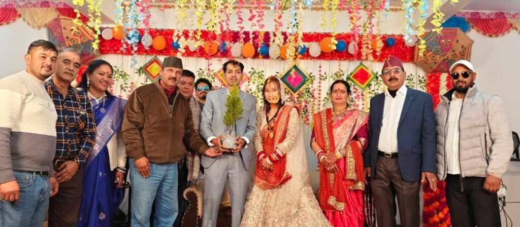 नैनीताल। सरोवर नगरी में राज्य आंदोलनकारी दिनेश गुरुरानी द्वारा राज्य में चलाया जा रहा अनूठा पौधारोपण  अभियान आज 508 वें दिन भी जारी रहा।पौधारोपण अभियान को विवाह समारोह से जोड़ने के कार्यक्रम के तहत आज अभियान के 508 वें दिन डीडीहाट के उदय पैलेस में विवाह समारोह कार्यक्रम के तहत बरला निवासी रवीन्द्र डसीला व मंजू डसीला के पुत्र योगेश व पुत्रवधू रितु ने प्रणय सूत्र में बधने के बाद एक पौधा धरती मां के नाम के तहत प्रणय पौधलगाया। योगेश व रितु ने कहा कि वह अपनी हर सालगिरह पर पौधारोपण करेंगे। व लगाए गए पौधे का संरक्षण भी करेंगे। रविंद्र डसीला ने कहा कि पर्यावरण संरक्षण से हर किसी को जुड़ना चाहिए उन्होंने कहा कि पौधारोपण अभियान से जुड़ना वह अपना सौभाग्य समझते हैं। कार्यक्रम में उदय पैलेस के मालिक लक्ष्मण सिंहडसीला, सामाजिक कार्यकर्ता अर्जुन कन्याल ,प्रदीप कन्याल ,भूपेंद्र कन्याल, रेनू कुवर, मीना डसीला ,भूपेंद्र डसीला, त्रिभुवनडसीला, कल्याण डसीला, रमेश डसीला,,, विजेंद्र मेहता सहित गणमान्य लोग उपस्थित रहे।