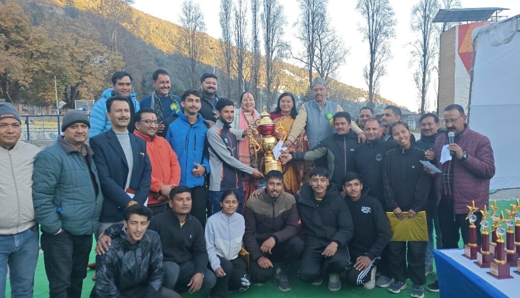 नैनीताल। सरोवर नगरी के डीएसए ग्राउंड में एन टी जी और डी एस ए ओपन वॉलीबॉल टूर्नामेंट के तत्वाधान में दो दिवसीय वॉलीबॉल प्रतियोगिता का फाइनल मुकाबला नैनीताल फ्लैट्स और हाईकोर्ट ऑफिशियल के बीच खेला गया। रोमांचक मुकाबले में नैनीताल फ्लैट्स ने लगातार 2 सेटों में जीत दर्ज करते हुए फाइनल ट्रॉफी पर कब्जा जमाया। इस मौके पर मुख्य अतिथि विधायक श्रीमती सरिता आर्या, विशिष्ट अतिथि भाजपा महिला मोर्च की नगर अध्यक्ष कविता गंगोला, सांसद प्रतिनिधि गोपाल रावत, होटेलियन व समाजसेवी लोकेश जोशी, भाजपा जिला उपाध्यक्ष दया किशन पोखरिया, अनिल गाड़िया रहे। सभी अतिथियों का वॉलीबॉल सचिव शैलेन्द्र बरगली ने सभी का स्वागत किया। टूर्नामेंट में खीमराज देऊपा के द्वारा अपने पिताजी शहीद दर्पण सिंह देऊपा की याद में मैंन ऑफ द मैच रोहित और मैन ऑफ द टूर्नामेंट तेजस के नाम रहा। दोनों को ट्रॉफी देकर सम्मानित किया गया। रेफरी के रूप में मोहन कोरंगा, पुरान बिष्ट, मनोज वर्मा, स्कोरर मदन बिष्ट रहे। इस मौके पर मैच में सहयोग करने वाली कमेटी में अरविंद पडियार, खजान डंगवाल, आनंद बिष्ट, संतोष कुमार, मोहित लाल साह, लाल सिंह बिष्ट, मोहित रौतेला, चंद्र लाल साह, मुकेश साह, गोविंद बोरा, कमल बिष्ट, दीपक बिष्ट, भूपेंद्र बिष्ट, बालम मेहरा, गोविंद बिष्ट, रोहित भाटिया, सुरेश चंद्रा आदि बहुत सारे खेल प्रेमी मौजूद रहे। संचालन मनोज बिष्ट एवं नीरज बिष्ट के द्वारा किया गया।