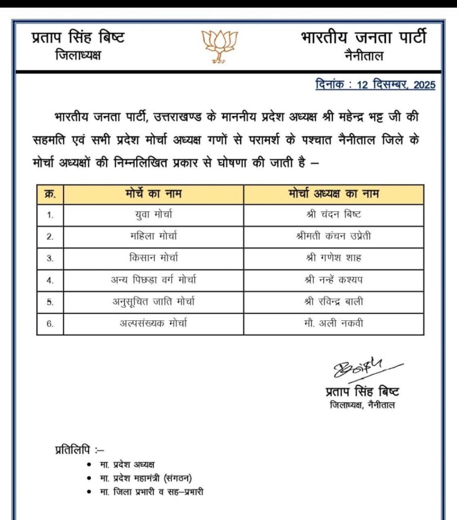 हल्द्वानी नैनीताल। भारतीय जनता पार्टी, उत्तराखण्ड के प्रदेश अध्यक्ष श्री महेन्द्र भट्ट की सहमति एवं सभी प्रदेश मोर्चा अध्यक्ष गणों से परामर्श के पश्चात जिला अध्यक्ष प्रताप बिष्ट ने नैनीताल जिले के मोर्चा अध्यक्षों की घोषणा की है।