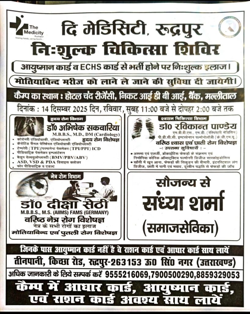 दिल की बीमारियों संबंधित निशुल्क चिकित्सा शिविर का आयोजन कल रविवार चंद्र रीजेंसी मल्लीताल में