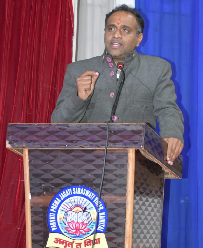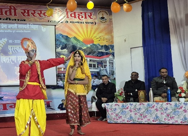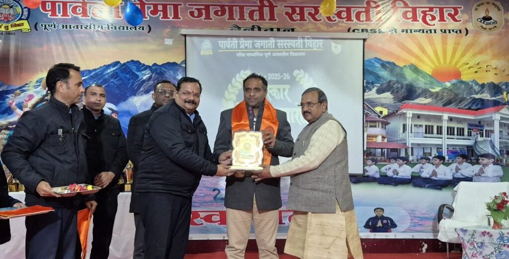 नैनीताल सरोवर नगरी के प्रतिष्ठित पार्वती प्रेमा जगाती सरस्वती विहार में विद्यार्थियों के शैक्षिक, सांस्कृतिक एवं खेलकूद क्षेत्र में उत्कृष्ट प्रदर्शन को प्रोत्साहित करने हेतु पुरस्कार वितरण समारोह का भव्य आयोजन किया गया। समारोह में मुख्य अतिथि डॉ मंजुनाथ टी.सी. वरिष्ठ पुलिस अधीक्षक ने छात्रों को प्रेरित किया और होनहारों को पुरस्कार वितरित किए। कार्यक्रम की अध्यक्षता विद्यालय के प्रबंधक श्याम अग्रवाल जी ने की। इस अवसर पर विद्यालय के प्रधानाचार्य डॉ. सूर्य प्रकाश एवं उप-प्रधानाचार्य श्री उमेश उपस्थित रहे। कार्यक्रम की शुरुआत दीप प्रज्वलन तथा सरस्वती वंदना से की गई। इसके उपरांत छात्रों द्वारा विभिन्न भक्ति गीत और सांस्कृतिक नृत्य की मनोरम प्रस्तुति दी गई। प्रबंधन टीम द्वारा मुख्य अतिथि को सम्मान स्वरूप मोमेंटो भेंट किया गया। मुख्य अतिथि डॉ मंजुनाथ टी.सी. ने शिक्षा, सांस्कृतिक और खेलकूद में उत्कृष्ठ प्रदर्शन करने वाले छात्रों को पुरस्कार(ट्रॉफी और शील्ड) वितरित किए और उज्ज्वल भविष्य की शुभकामनाएं दी। उन्होंने विद्यालय में सकारात्मक वातावरण स्थापित करने तथा वैदिक संस्कृति और नैतिक मूल्यों को हर विद्यार्थी में विकसित करने में योगदान के लिए गुरुजनों और प्रबंधन कमिटी को धन्यवाद व्यक्त किया। इस दौरान उन्होंने कहा पेड़ वही बड़ा है जिसकी जड़ें गहराई तक जाता है” जो व्यक्ति अपने संस्कारों और संस्कृति को बरकरार रखते हुए प्रोद्यौगिकी को आजमाता है वहीं सफल होता है। आप देश के नौनिहाल हो आपके अलग–अलग क्षेत्रों में योगदान और आपकी मेहनत से ही देश आगे बढ़ेगा और विश्वगुरु बनेगा। देश के लिए मरना बहुत आसान है पर देश के लिए जीना बहुत मुश्किल है। नियमों का पालन करें, हमें अगर एक बड़ी लड़ाई जीतनी है तो हर छोटी लड़ाई जीतनी होगी चाहे वह लड़ाई नशे के विरुद्ध हो या आतंकवाद के। हमें जिम्मेदार नागरिक बनना पड़ेगा। मेधावी और विजई छात्रों को प्रेरित करते हुए कहा की “पुरस्कार विद्यार्थियों के कठिन परिश्रम का सम्मान होते हैं और यह आगामी परीक्षाओं में बेहतर प्रदर्शन करने की प्रेरणा देते हैं।” उन्होंने छात्रों से जीवन में लक्ष्य निर्धारित कर अनुशासन और निरंतर परिश्रम के साथ आगे बढ़ने का आह्वान किया। उन्होंने शिक्षकों व अभिभावकों के सहयोग और समर्पण के लिए आभार जताया।समारोह के दौरान विद्यालय प्रांगण में छात्रों के उत्साह और गर्व के वातावरण से मुख्य अतिथि का हृदय प्रफुल्लित हो उठा। कार्यक्रम में विभिन्न कक्षाओं के मेधावी विद्यार्थियों को पुरस्कार प्रदान किए गए। 10 वीं बोर्ड में सर्वोच्य अंक प्राप्त करने वाले विनय पाठक, आयुष सिंह को 25000 की पुरुस्कार राशि सहित ट्राफी प्रदान की