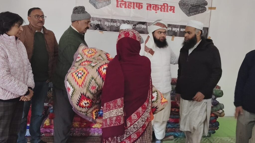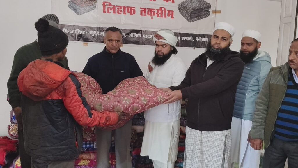 नैनीताल। सरोवर नगरी में कड़ाके की सर्दी में लोगों का जीना दुबर कर रखा है और सुबह शाम पड़ रही कड़ाके की ठंड को देखते हुए जमीयत उलेमा ए हिन्द नैनीताल शाखा द्वारा व्यापार मंडल मल्लीताल अध्यक्ष किशन सिंह नेगी के नेतृत्व में शहर की प्रसिद्ध जामा मस्जिद में जरूरतमंदो को रजाइयां वितरित की गई। ताकि ठंड के मौसम में असहाय लोगों को ठंड से राहत मिल सके। जमीयत के नगर अध्यक्ष मुफ्ती अजमल ने बताया कि कमेटी द्वारा देश भर में विभिन्न सामाजिक कार्य किए जाते है जिसमें गरीब तबके के लोगों को राहत सामग्री देने के साथ ही बेटियों की शादी ब्याह के लिए मदद की जाती है। इसी कड़ी में आज नैनीताल इकाई द्वारा 40 निर्धन लोगों को रज़ाई वितरित की गई है। उन्होंने कहा युवाओं मे बढ़ती नशे की लत को देखते हुए कमेटी द्वारा घर घर जाकर जागरूकता अभियान चलाया जा रहा है। ताकि युवाओं को नशे की गिरफ्त में आने से बचाया जा सके। इस मौके पर