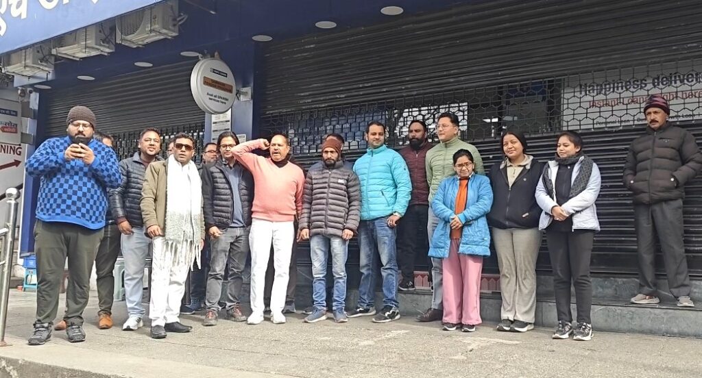 नैनीताल। सरोवर नगरी में सभी सरकारी बैंकों द्वारा इंडियन बैंक एसोसिएशन और यूनाइटेड बैंक फॉर्म इंडिया के संयुक्त तत्वाधान में आज अपनी एक सूत्री पांच दिवसीय बैंकिंग की मांग वर्ष 2015 से चली आ रही है। और अपनी इसी मांगों को लेकर कर्मचारी मंगलवार को हड़ताल पर है। प्रातः कर्मचारियों ने अंतर्राष्ट्रीय बैंक आईसीआईसीआई और एचडीएफसी बैंकों को जाकर बंद कराया। और एचडीएफसी बैंक के प्रांगण में खड़े होकर वित्त मंत्रालय के खिलाफ जमकर नारेबाजी की है। अध्यक्ष प्रवीण शाह ने बताया की सरकार इस मांग को लेकर तवज्जे नहीं दे रही है जबकि कॉविड-19 आपदा आई थी तो कर्मचारियों ने अपना संपूर्ण समर्थन और सहयोग सरकार को दिया था। जिसका प्रधानमंत्री नरेंद्र मोदी द्वारा सराहना भी की गई थी। इसके बावजूद भी पिछले दो सालों से हमारा संगठन का एग्रीमेंट वित्त मंत्रालय मे 2 साल से पड़ा है इस पर सरकार द्वारा कोई संज्ञान नहीं लिया गया उसी से नाराज होकर आज पूरे देश में बैंक कर्मचारी हड़ताल पर हैं और अगर जल्दी ही वित्त मंत्रालय और सरकार द्वारा पांच दिवसीय बैंकिंग लागू करने मांग पूरी नहीं की जाती तो प्रदेश संगठन के आह्वान पर कर्मचारी अनिश्चितकालीन हड़ताल पर जाने को विवश होंगे जिसकी पूर्ण जिम्मेदारी वित्त मंत्रालय और भारत सरकार की होगी। इस दौरान वित्त मंत्री मुर्दाबाद के नारे भी लगाए गए और सरकार का विरोध भी किया गया इस मौके पर अध्यक्ष प्रवीण शाह महामंत्री अभिषेक अधिकारी शिखर शाह रोहित केशले, गौरव तिवारी, अंकित भट्ट, अतुल शाह, हर्ष शाह, अरुण, समीर राज, मोहन जोशी, राहुल शाह, योगेश शाह, पंकज खुल्बे, अनिल कुलोरा, रोशन बिष्ट,रमेश बिष्ट, चंदन राजपूत, सहित दर्जनों बैंक कर्मचारी मौजूद थे।