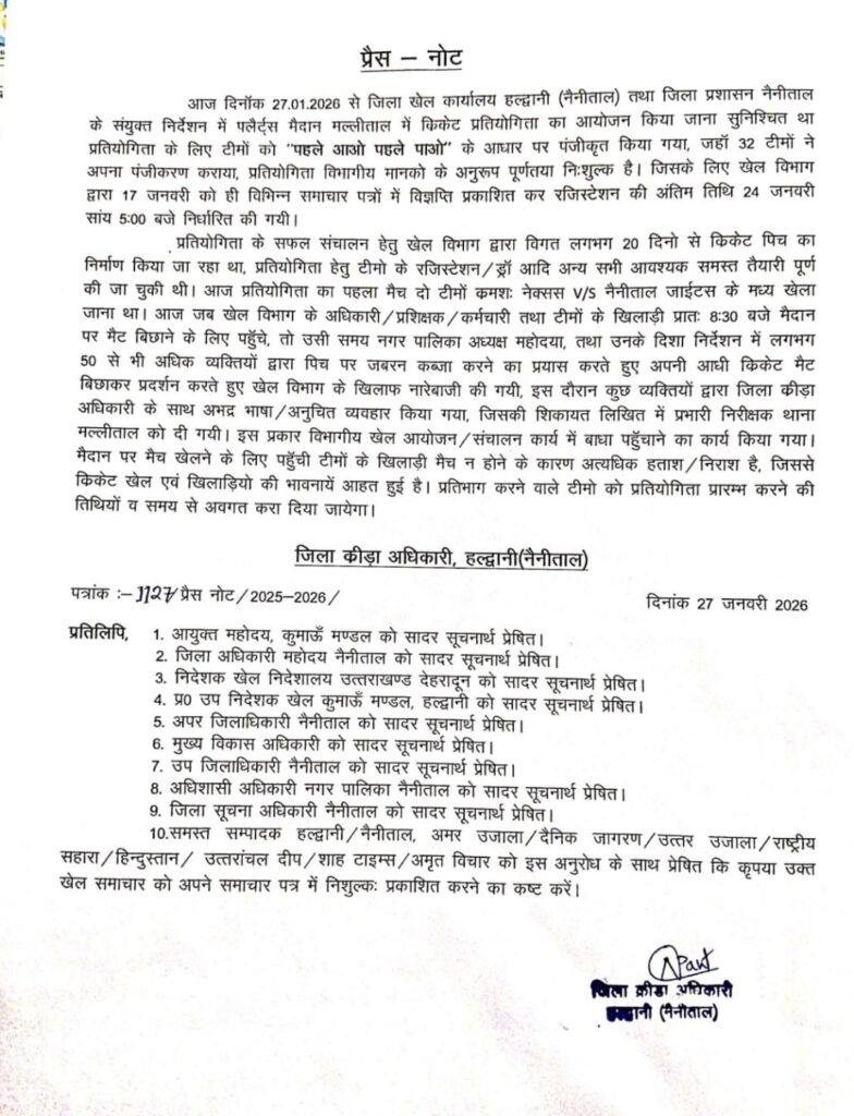 नैनीताल। सरोवर नगरी में मंगलवार प्रातः जिला खेल अधिकारी निर्मला पंत और पालिका अध्यक्ष डॉक्टर सरस्वती खेतवाल के बीच टूर्नामेंट को लेकर विवाद हो गया था और मामला कोतवाली तक पहुंच गया था उसी को लेकर जिला खेल कार्यालय द्वारा एक प्रेस विज्ञप्ति जारी कर अवगत कराया की जिला प्रशासन नैनीताल के संयुक्त निर्देशन में पलैर्ट्स मैदान मल्लीताल में किकेट प्रतियोगिता का आयोजन किया जाना सुनिश्चित था प्रतियोगिता के लिए टीमों को ‘पहले आओ पहले पाओ” के आधार पर पंजीकृत किया गया, जहाँ 32 टीमों ने अपना पंजीकरण कराया, प्रतियोगिता विभागीय मानको के अनुरूप पूर्णतया निःशुल्क है। जिसके लिए खेल विभाग द्वारा 17 जनवरी को ही विभिन्न समाचार पत्रों में विज्ञप्ति प्रकाशित कर रजिस्टेशन की अंतिम तिथि 24 जनवरी सांय 5:00 बजे निर्धारित की गयी। प्रतियोगिता के सफल संचालन हेतु खेल विभाग द्वारा विगत लगभग 20 दिनो से किकेट पिच का निर्माण किया जा रहा था, प्रतियोगिता हेतु टीमो के रजिस्टेशन / ड्रॉ आदि अन्य सभी आवश्यक समस्त तैयारी पूर्ण की जा चुकी थी। आज प्रतियोगिता का पहला मैच दो टीमों कमशः नेक्सस V/S नैनीताल जाईटस के मध्य खेला जाना था। आज जब खेल विभाग के अधिकारी / प्रशिक्षक / कर्मचारी तथा टीमों के खिलाड़ी प्रातः 8:30 बजे मैदान पर मैट बिछाने के लिए पहुँचे, तो उसी समय नगर पालिका अध्यक्ष महोदया, तथा उनके दिशा निर्देशन में लगभग 50 से भी अधिक व्यक्तियों द्वारा पिच पर जबरन कब्जा करने का प्रयास करते हुए अपनी आधी किकेट मैट बिछाकर प्रदर्शन करते हुए खेल विभाग के खिलाफ नारेबाजी की गयी, इस दौरान कुछ व्यक्तियों द्वारा जिला कीड़ा अधिकारी के साथ अभद्र भाषा/अनुचित व्यवहार किया गया, जिसकी शिकायत लिखित में प्रभारी निरीक्षक थाना मल्लीताल को दी गयी। इस प्रकार विभागीय खेल आयोजन / संचालन कार्य में बाधा पहुँचाने का कार्य किया गया। मैदान पर मैच खेलने के लिए पहुँची टीमों के खिलाड़ी मैच न होने के कारण अत्यधिक हताश / निराश है, जिससे किकेट खेल एवं खिलाड़ियो की भावनायें आहत हुई है। जिला खेल अधिकारी निर्मला पंत ने कहां प्रतिभाग करने वाले टीमो को प्रतियोगिता प्रारम्भ करने की तिथियों व समय से अवगत करा दिया जायेगा।