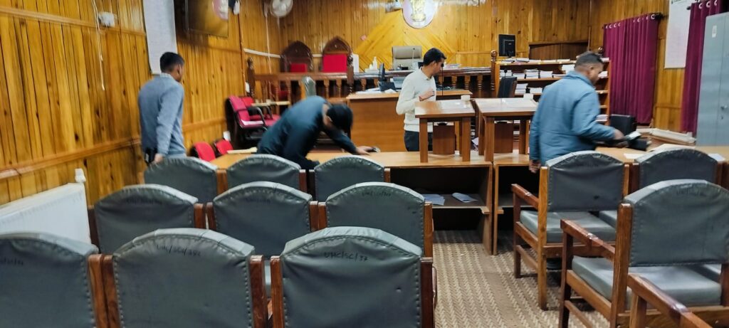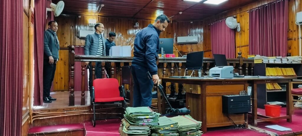 नैनीताल सरोवर नगरी में डॉ0 जगदीश चंद्र एसपी नैनीताल के नेतृत्व में रविकांत सेमवाल सीओ नैनीताल, राकेश बिष्ट मुख्य सुरक्षा अधिकारी मा0 उच्च न्यायालय उत्तराखंड नैनीताल, प्रभारी निरीक्षक मल्लीताल, BDS/डॉग स्क्वाड समेत पुलिस टीमों ने उच्च न्यायालय उत्तराखंड नैनीताल परिसर में चलाया सघन चैकिंग अभियान। परिसर में आवागमन करने वाले प्रत्येक व्यक्ति पर पैनी नजर रखे हुए प्रभावी Anti Sabotage चेकिंग और फ्रिस्किंग की जा रही है। बता दें साथ ही जिले के सभी न्यायालय परिसरों में पुलिस की लगातार चेकिंग जारी है।