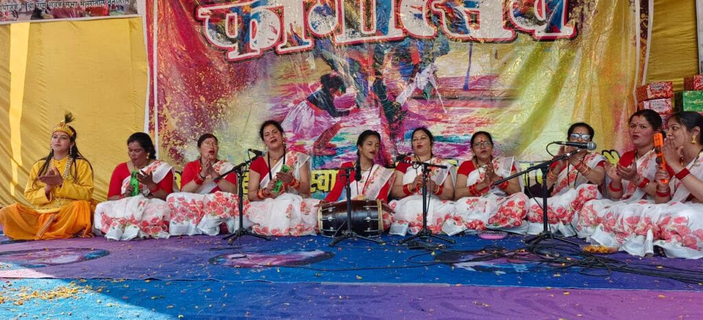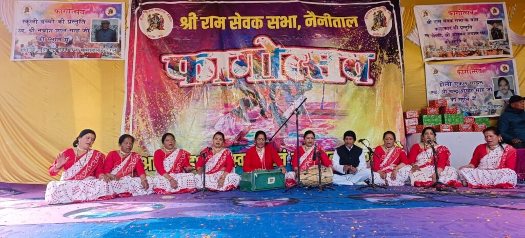 नैनीताल। सरोवर नगरी में श्री रामसेवक सभा,मल्लीताल नैनीताल द्वारा 30वें फागोत्सव के अंतर्गत आज सभी महिला होलियारो की टीमों द्वारा अपनी होली का मंचन किया गया,आज 15 महिला टीमों ने मंचन में प्रतिभाग किया जिसमें महिला होली दल कृष्णापुर, समर्पण वूमेन वेलफेयर सोसाइटी,मां जगदम्बा महिला होली समिति,मां वैष्णो देवी ग्रुप तल्लीताल, मां अम्बे तल्लीताल,प्रेरणा महिला संगठन नैनीताल,जय श्री हनुमते हनुमान मंदिर समिति नैनीताल,नैनी महिला एवं बाल विकास समिति सूखाताल, शेर का डांडा, सात नंबर नैनीताल,जय मां दूनागिरी सहायता समूह नैनीताल,जय मां वैष्णो समिति अयारपाटा ,मां पाषाण देवी महिला होली ग्रुप,नैनी महिला जागृति संस्था नैनीताल,नैनी जागृति समूह नैनीताल, रिद्धि-सिद्धि होली दलो ने श्री राम सेवक सभा प्रांगण में अपनी प्रस्तुती पेश की इस दौरान भारी संख्या में जनता ने दलों की प्रस्तुति का खूब आनंद लिया, फागोत्सव के कार्यक्रम का संचालन हेमंत बिष्ट , मीनाक्षी कीर्ति जी व श्री मुकेश जोशी मोंटू, प्रो ललित तिवारी द्वारा संयुक्त रुप से किया गया। मेरी नैया पार लगाए गंगा सागर में , बाके बिहारी तुझे देख कर मेरे नयना उलझ गएचुनरी रंगा दो आओ बाके बिहारी रंगीला आओ बाके बिहारी , गोकुल से कान्हा आने लगे होली का ये दिन आ गया होली खेलत है कैलाश पति ,तीनों लोको में होली , मैं बता होली खेलूंगा राधा तेरे अंगना में,रंग खेलुला धूम मचूला, रंग खेलुला धूम मचूला के होली गीतों से गुंजायमान है नैनीताल। स्वांग के द्वारा मोबाइल का प्रयोग कम करे ,सहित शराब एवं बदलते परिवारिक चक्र पर प्रस्तुति हुई । प्रत्येक टीम के एक होली गायक को सम्मानित किया गया । सम्मानित होने वाली में मीणा शर्मा ,संगीता अग्रवार ,भावना बिष्ट ,हिमानी रौतेला ,भावना ,लता रावत ,रेणु कोहली ,अंजू बिष्ट ,गीता बिष्ट ,शांति रावत ,गीता ,कमला रावत ,भगवती बिष्ट , वंदना तिवारी ,भगवती शर्मा सम्मानित हुए। कार्यक्रम में नगर पालिका अध्यक्ष डा सरस्वती खेतवाल, राम सेवक सभा के अध्यक्ष मनोज लाल साह,महासचिव जगदीश चंद्र बवाड़ी, प्रबंधक विमल चौधरी, उपाध्यक्ष अशोक शाह, पूर्व महासचिव राजेंद्र लाल साह,पूर्व नगर पालिका अध्यक्ष मुकेश जोशी मोंटू , राम सेवक सभा के सदस्य मोहित लाल साह, देवेंद्र लाल साह, डा. ललित तिवारी,भीम सिंह कार्की, कैलाश बोरा, आशु,राजेंद्र सिंह बजेठा,गिरीश भट्ट,मिथिलेश पांडे, ललित मोहन साह, गिरीश जोशी मक्खन, हीरा सिंह रावत, गोधन सिंह बिष्ट,आनंद सिंह बिष्ट, गोविंद सिंह,कोषाध्यक्ष बिमल साह, केदार राठौर,खुशहाल सिंह कार्की,उमेश भट्ट, रंजीत शर्मा,सभासद ललिता दफोटी,अमिता साह,आभा शाह, रानी साह,विनीता पांडे,दीपिका बिनवाल,दीप्ति साह,दीपा पांडे,मंजू रौतेला,जीवंती भट्ट,ज्योति ढोंड