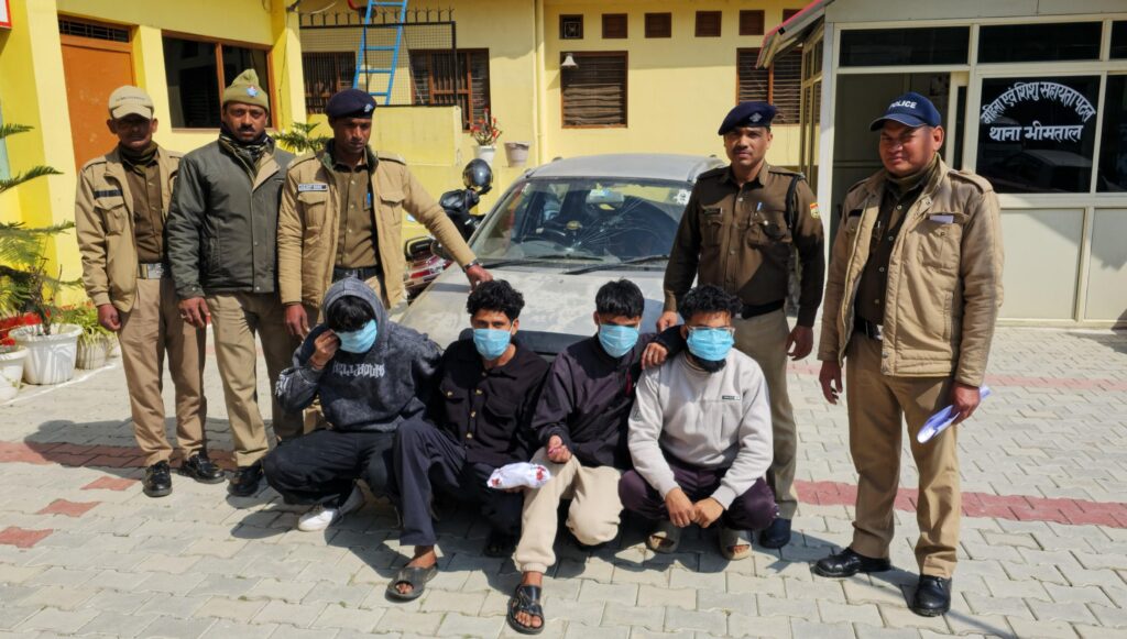 भीमताल नैनीताल। ड्रग फ्री देवभूमि मिशन को सार्थकता प्रदान करने के उद्देश्य से जनपद में मादक पदार्थों की तस्करी की रोकथाम हेतु डॉ0 मंजूनाथ टी0सी0 एस0एस0पी0 नैनीताल द्वारा सभी अधीनस्थों को वृहद स्तर पर चैकिंग अभियान चलाये जाने तथा तस्करों की गिरफ्तारी करने के सख्त दिशा-निर्देश दिये गये हैं। बता दें इसी क्रम में डॉ० जगदीश चंद्र पुलिस अधीक्षक नैनीताल व रविकांत सेमवाल सीओ नैनीताल/भवाली के पर्यवेक्षण तथा राजेश यादव प्रभारी निरीक्षक भीमताल के नेतृत्व में नशे के सौदागरों को गिरफ्तार करने व नशे की प्रवृति पर रोकथाम लगाने हेतु दिये गये निर्देश के क्रम में पुलिस टीम द्वारा दिनांक 25 फरवरी को भीमताल क्षेत्र के चॉफी रोड वन विभाग बैरियर के पास चैकिंग के दौरान धानाचूली बैण्ड से भीमताल की तरफ से एक अल्टो कार सं0 यू के 06 के 4585 में 04 अभियुक्तों को अवैध चरस की तस्करी करते हुए गिरफ्तार किया गया। अभियुक्तों के विरुद्ध थाना भीमताल पर मु0अ0सं0 09/2026 धारा 8/20/60 एनडीपीएस एक्ट पंजीकृत किया गया इस मौके पर