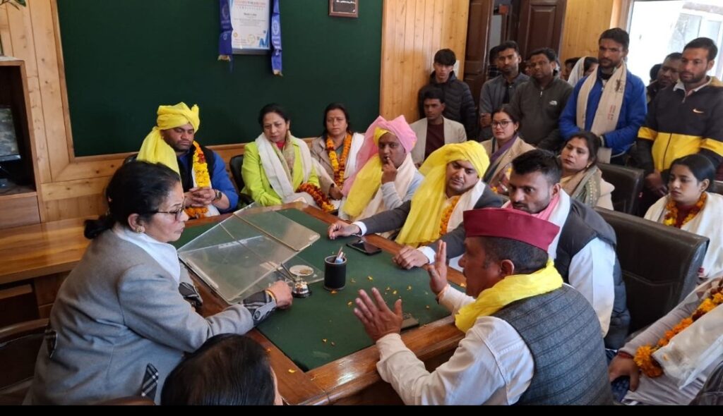 नैनीतालl सरोवर नगरी नवनियुक्त पालिका अध्यक्ष डॉक्टर सरस्वती खेतवाल ने शपथ लेने के पश्चात पालिका सभागार में परिचय बैठक लेने के पश्चात अपने कार्यालय में सभी सभासदों के साथ बैठकर शहर के विकास को लेकर साथ मिलकर चलने को लेकर निवेदन कियाl और सभी सभासदों से कहा कोई भी सभासद मेरे पर प्रेशर ना बनाएं किसी भी कार्य को लेकर पालिका और मेरी इज्जत को धूमिल न करने का प्रयास करें अगर कोई प्रेशर बनाएगा तो मुझे अपने पद से इस्तीफा देने में देरी नहीं लगेगीl उन्होंने पालिका अधिकारियों के परिचय देते हुए कहां सभासदो साथ लेकर और राय मसवरे से पालिका और शहर की तरक्की के लिए एक साथ कार्य करेंl आपको बता दें नव नियुक्त पालिका अध्यक्ष डॉक्टर सरस्वती खेतवाल एक समाज सेविका है और साफ छवि की ईमानदार व्यक्ति हैl इस बात से इनकार नहीं किया जा सकताl