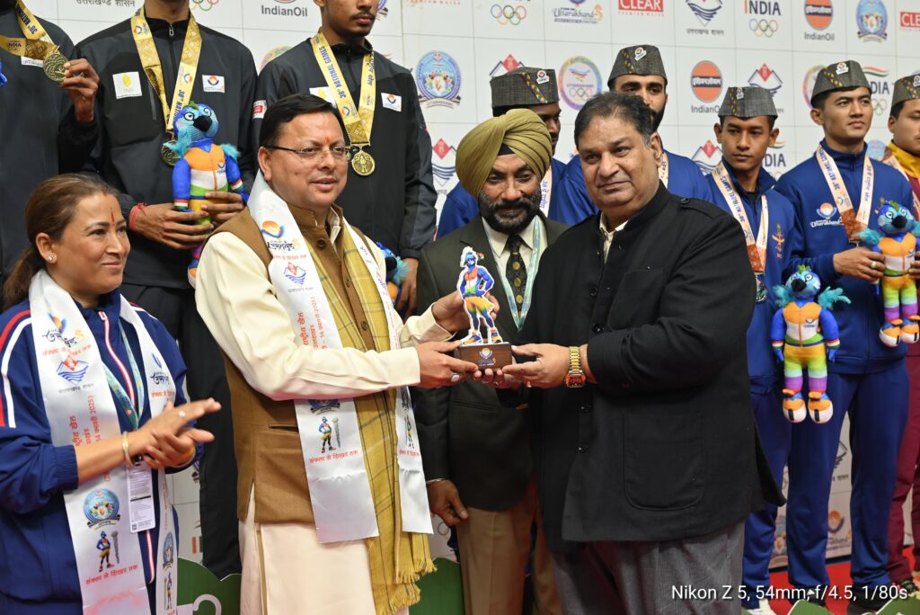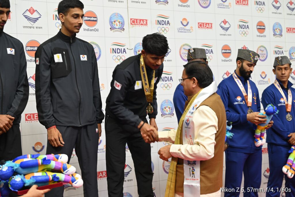 इस दौरान मुख्यमंत्री ने अधिकारियों को निर्देश दिए कि कार्यक्रम के दौरान किसी भी प्रकार की कोई भी समस्या न हो इस हेतु सभी व्यवस्थाएं चाक चौबंद हो। इस अवसर पर मुख्यमंत्री धामी ने फैनसिंग के प्रथम, द्वितीय एवं तृतीय प्रतिभागियों से परिचय प्राप्त कर उन्हें मेडल प्रदान कर सम्मानित किया गया। उन्होंने निशानेबाजी प्रतिभागियों का मनोबल बढाते हुये उत्साहवर्धन किया।