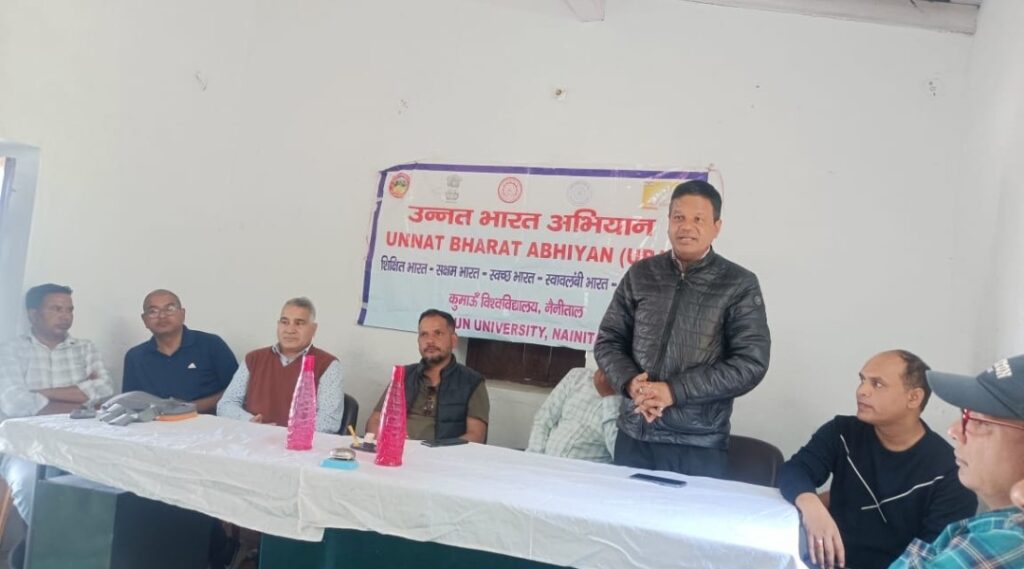 नैनीतालl सरोवर नगरी में उन्नत भारत अभियान के तहत कुमाऊं विश्वविद्यालय नैनीताल की टीम ने चयनित ग्राम देवीधुरा (पटुवा डांगर, नैनीताल) में ग्रामीणों के साथ एक बैठक का आयोजन किया गयाl जिसमें विश्वविद्यालय टीम द्वारा ग्रामीणों को ग्राम देवीधुरा को उन्नत भारत अभियान के तहत गोद लेने एवं उनके ग्राम में जन जागरूकता कार्यक्रम, स्वास्थ्य कैंप, रोजगारपरक कार्यक्रम, वृक्षारोपण आदि के समय समय पर आयोजन संबंधी जानकारी देने के साथ उनसे इसमें समुचित सहयोग की अपील भी की गई। साथ ही उनसे अपेक्षा की गई कि वे उन्नत भारत कार्यक्रम के अंतर्गत विश्विद्यालय के इस कार्यक्रम से जुड़कर लाभान्वित होंगे तथा अपने ग्राम को आदर्श एवं उन्नत बनाने के लिए भरपूर सहयोग देंगे। उक्त कार्यक्रम में बोलते हुए निदेशक विजिटिंग प्रोफेसर निदेशालय तथा विभागाध्यक्ष वनस्पति प्रोफेसर ललित तिवारी ने उन्नत भारत के कार्यक्रम में ग्रामीणों से बढ़चढ़ कर भाग लेने की अपील की तथा बताया कि उन्नत भारत अभियान सरकार का ऐसा कार्यक्रम है जेसे गांव तक विश्वविद्यालय पहुंच सके तथा टेक्नोलॉजी एवं अकादमिक कार्यों से गांवों को अवगत करा सके। निदेशक उन्नत भारत अभियानप्रोग अनिल बिष्ट ने कार्यक्रम की रूपरेखा को ग्रामीणों को अवगत कराया तथा बताया कि उत्तराखंड में इस कार्यक्रम का नोडल अधिकारी रुड़की के इंडियन इंस्टीट्यूट ऑफ टेक्नोलॉजी को बनाया गया है तथा कुमाऊं विश्वविद्यालय इस पर अपनी भूमिका सुनिश्चित करेगा । ज्येष्ठ प्रमुख हिमांशु पांडे ने कहा कि विश्वविद्यालय की यह नेक पहल है जिससे विकासबके करें में देवीधुरा पटवादनगर के लोग भी इसका फायदा उठा सकेंगे। ग्राम प्रधान डी रावत ने भी कार्यक्रम को संबोधित किया तथा पूर्ण सहयोग का आश्वासन दिया। बैठक में स्कूल में कंप्यूटर देने , मौन पालन , पौधारोपण कार्यक्रम में डॉ प्रकाश चन्याल डॉo जितेंद्र कुमार लोहनी, डॉ o ललित मोहन, डॉ दीपिका पंत, डॉ मनोज सत्याल, प्रधान आडू खान मनोज कुमार, देव सिंह बिष्ट सहित मातृ शक्ति मौजूद थेl