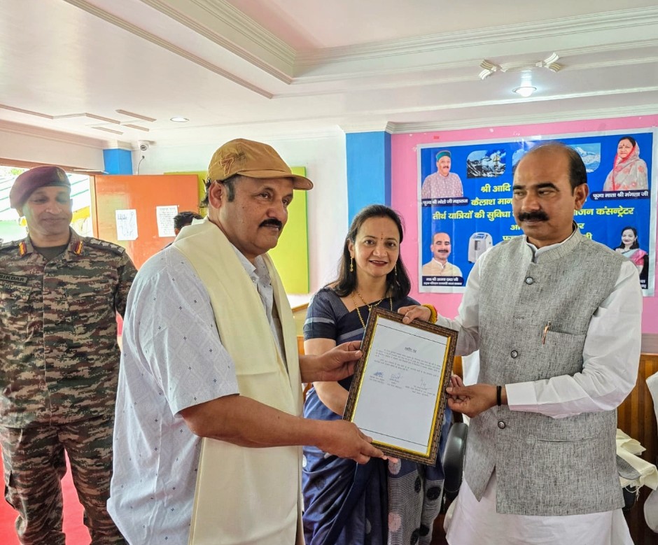 नैनीताल। नगर निगम सभागार पिथौरागढ़ में केंद्रीय सड़क परिवहन एवं राज्य राजमार्ग मंत्री अजय टम्टा ने कुमाऊं मंडल विकास निगम के प्रबंधक दिनेश गुरु रानी को जनपद में पर्यावरण संरक्षण के तहत किए जा रहे कार्यों के लिए शाल उड़ाकर व प्रशस्ति पत्र देकर सम्मानित किया।अजय टम्टा ने कहां कि दिनेश गुरु रानी द्वारा विगत कई वर्षों से पर्यावरण संरक्षण के क्षेत्र में सराहनीय कार्य किया जा रहा है। उनके द्वारा जो आदि कैलाश, कैलाश यात्रियों को हिमालय शपथ के माध्यम से पौधारोपण व स्वच्छता कार्यक्रम से जोड़ा जा रहा है वह सराहनीय कार्य है। उनके द्वारा उच्च हिमालय क्षेत्र में स्थित काला पानी नाभीढांग जोलिगकोग में यात्रियों के माध्यम से पौधारोपण किया जा रहा है।